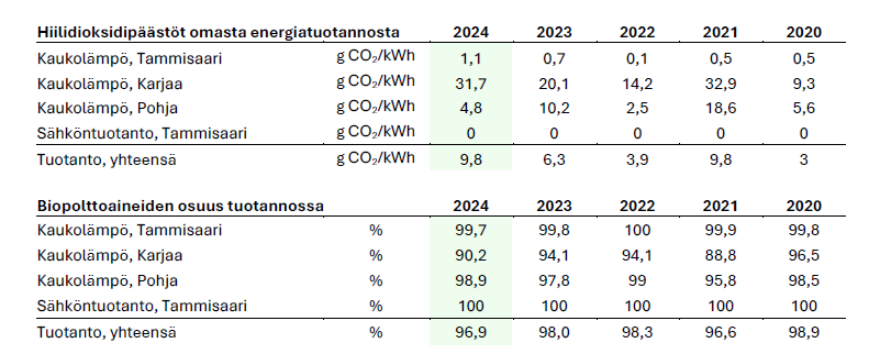 Olemme investoineet tuntuvasti ympäristöystävälliseen energiatuotantoon vuodesta 2001 lähtien ja olemme kestävän kehityksen edelläkävijöitä. Tuotamme nykyisin lähes kaiken kaukolämmön uusiutuvalla metsähakkeella. Laitoksissamme tehdyt päästömittaukset osoittavat alhaisia hiukkas-, NOx- ja SOx-päästöjä. Tammisaaren energiantuotannolle on myönnetty EKO-energiatodistus ja olemme olleet mukana energiatehokkuussopimuksessa vuodesta 2000.