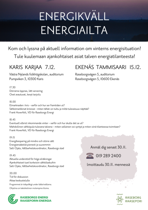 Raaseporin Energia ja Raaseporin kaupunki järjestävät kaikille avoimet energiaillat joulukuussa 2022. Energiaillat valaisevat ajankohtaista tilannetta sähkömarkkinoilla, sekä avittavat kaupunkilaisia pienentämään omaa sähkönkulutustaan.