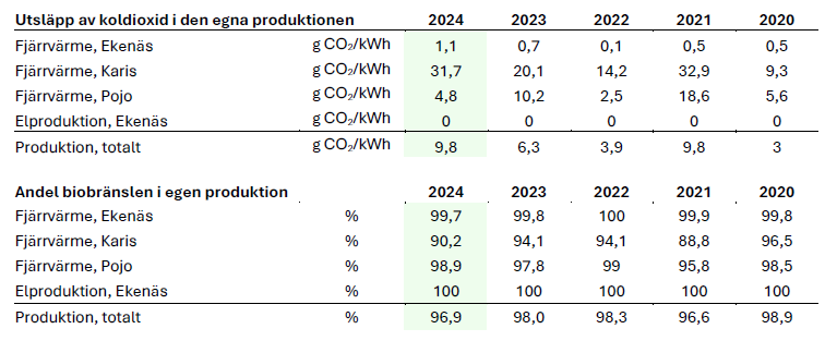 Koldioxidutsläpp och andel biobränslen i vår egen energiproduktion i Raseborg
